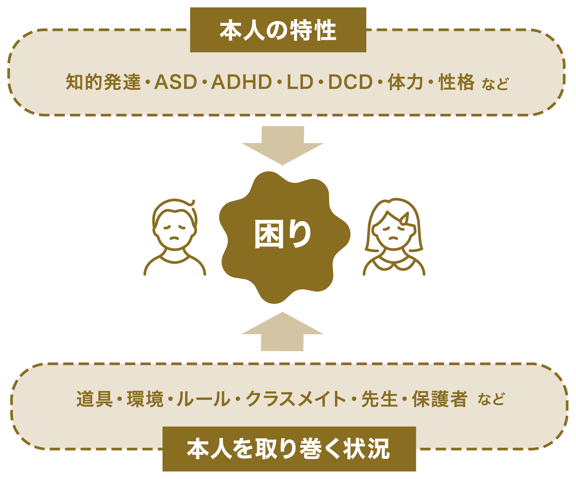ひばりんが解決を目指すのは"困り"です。障がいというと本人の内側にのみ"困り"の原因があるという印象を持たれる方もいるかもしれませんが、実は"困り"というのは道具や環境、まわりの人との関係性などの本人の外側にある原因も影響して複合的に形作られています。例えば、「黒板を写すのが苦手」という"困り"について考えてみると、「ワーキングメモリー」や「眼球運動」といった本人の特性が影響しているのと同時に、「ノートや鉛筆が合わない」「まわりが騒がしく集中できない」といった道具や環境とのミスマッチが影響していることもあります。ですから、"困り"は「本人の特性+本人を取り巻く状況」から生まれるという理解が大事です。