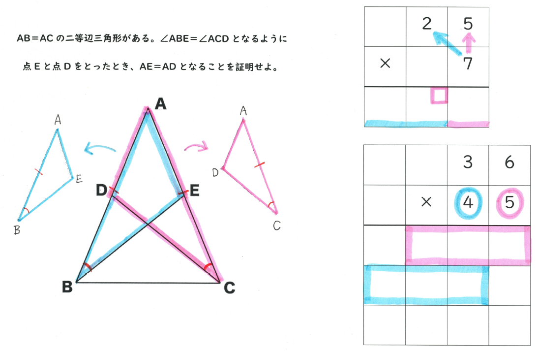 (例)文章題を図や絵で表して立式につなげる、計算や筆算で書く場所や順序をカラーペンで示す