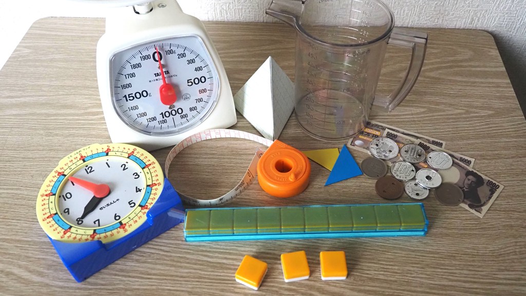プリントの情報だけだと理解が難しいときのためにさまざまな具体物の用意があります。