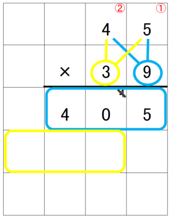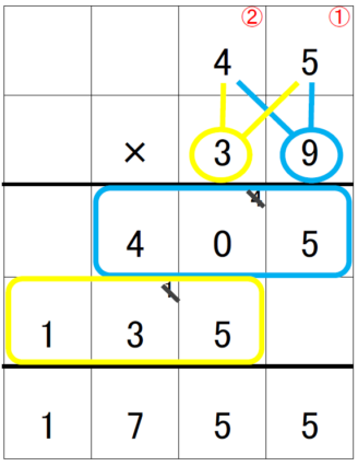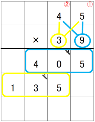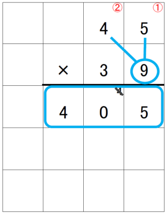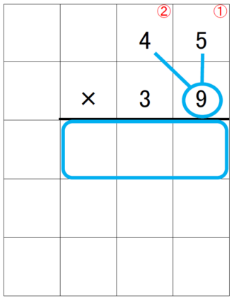 ➀ かける数を色ペン(マーカー等)で囲み、かけられる数と結びます。答えを書く枠も同じ色で作ります。かけられる数の上にかける順番も書きましょう。